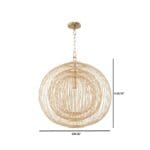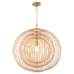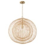 Crafted from stripped rattan and suspended with an aged brass decorative rectangle link chain, the Terrae Lighting Collection exudes a sense of organic beauty and understated luxury. The design’s dimensionality adds depth and visual interest, creating a captivating focal point with three layers of concentric shapes that add texture and complexity. With options of round, triangular, or bell-shaped shades, the Terrae pendants offer versatility and luminosity through one 60-watt socket.