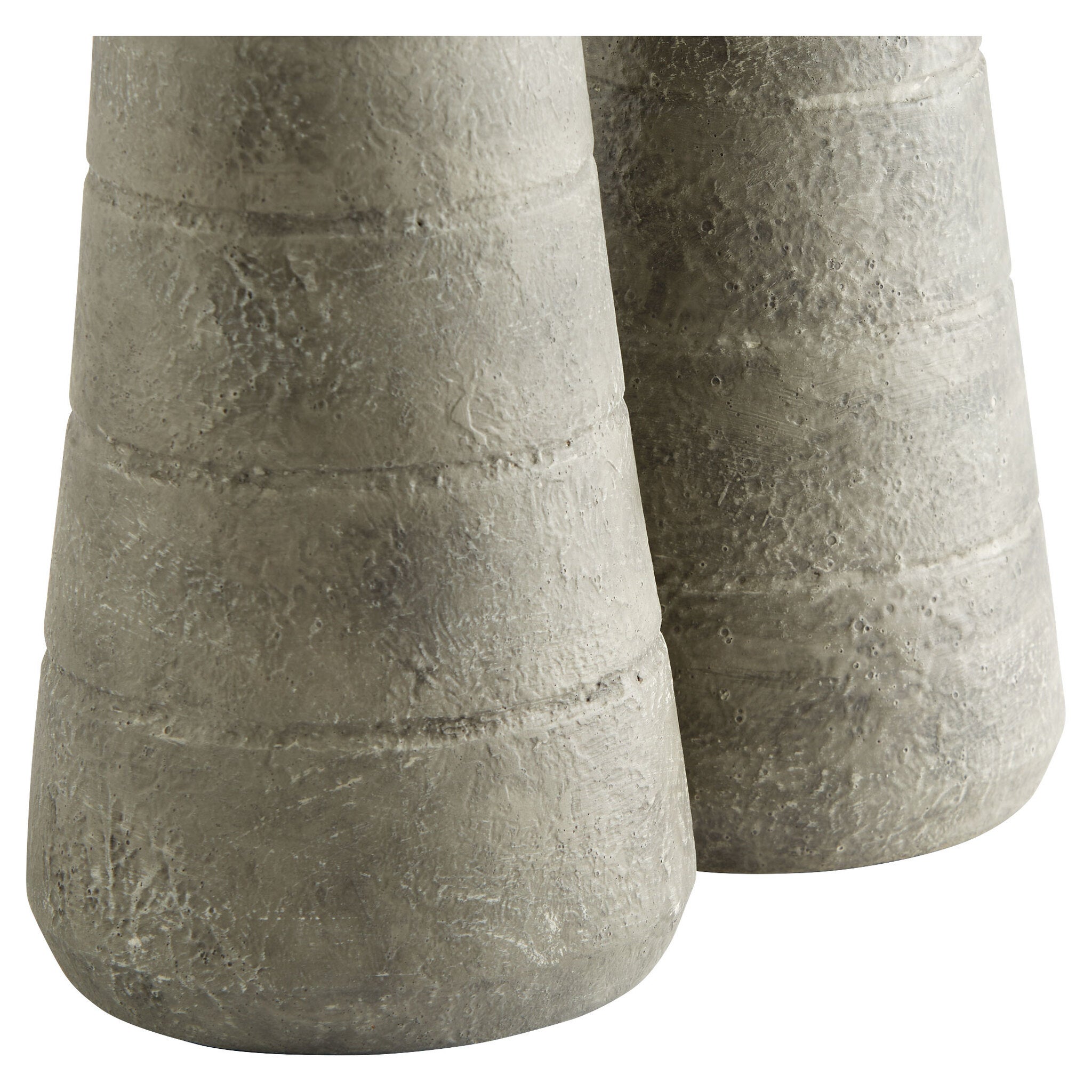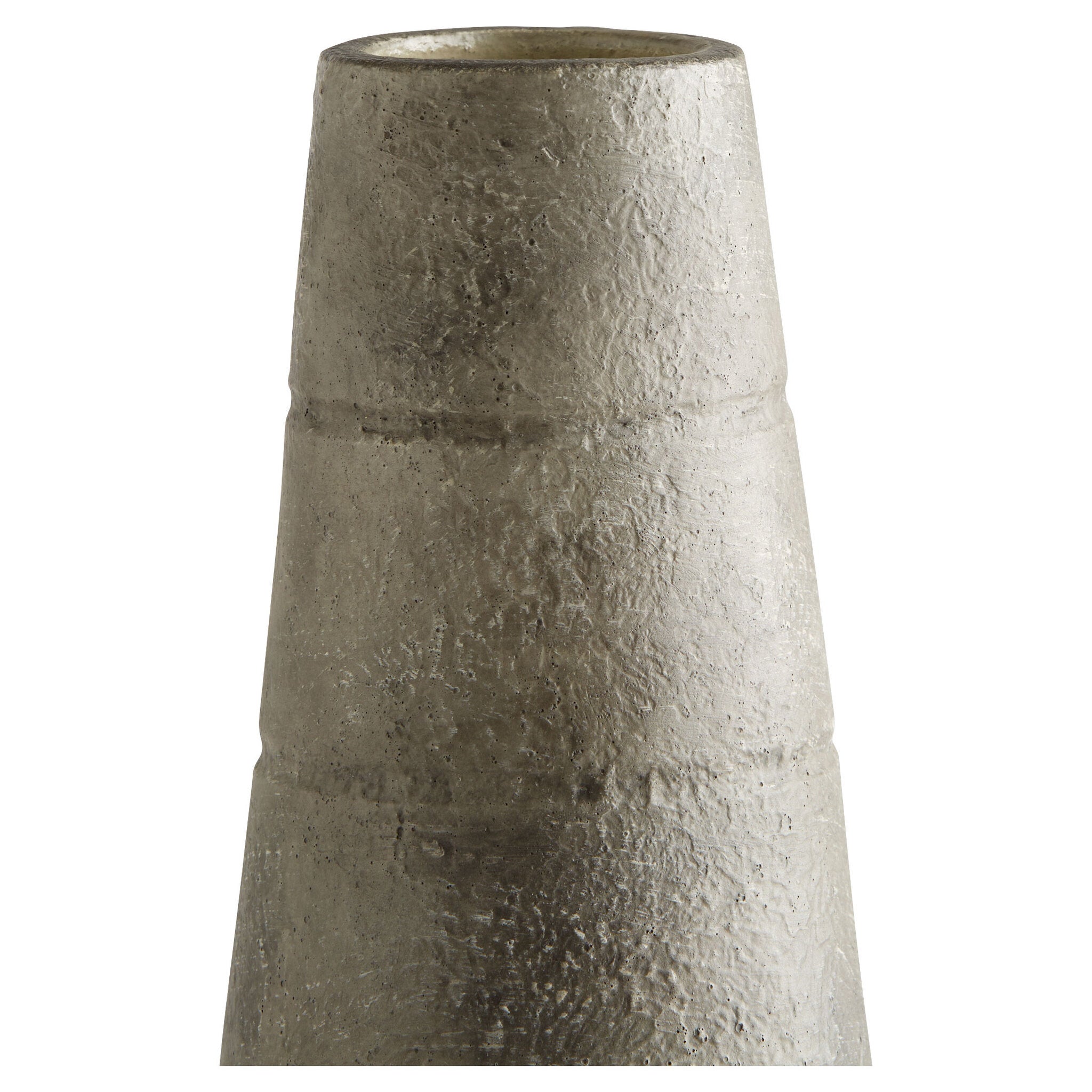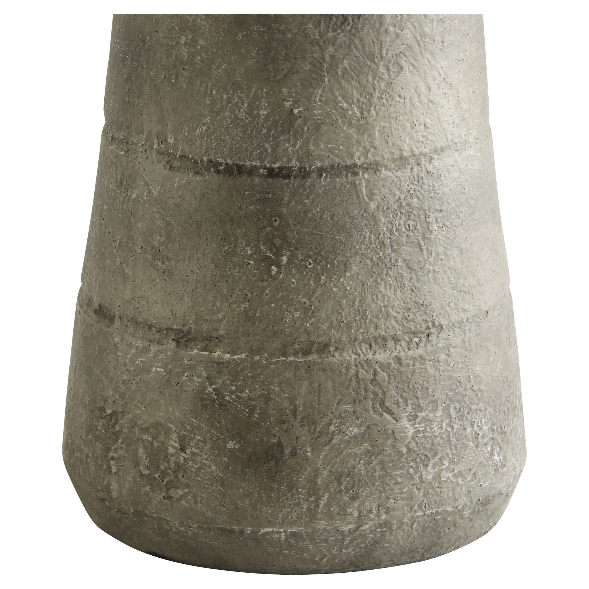 Thera, the ancient name for the volcanic island of Santorini, Greece, was influential in the design of this collection of cone-shaped earthenware vases. A medium-width base tapers to a slender rim with horizontal lines etched along the sides. A textured finish is applied, giving the series a concrete-like exterior. Display together or individually in any poolside covered patio design, kitchen, entryway or washroom. Available in two sizes and colorways. Not water-tight.