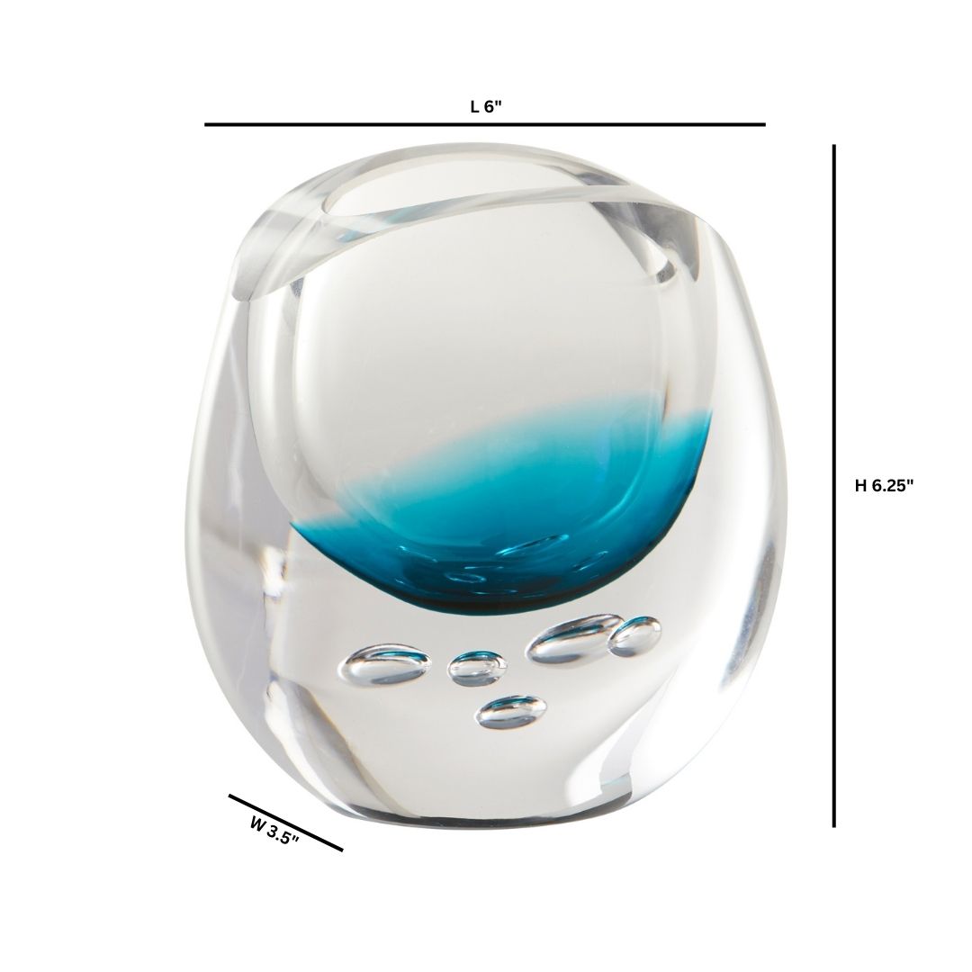 The Tidepool collection is a signature illustration of artful hand-blown cased glass. An inner layer of blue glass is sheathed by thick, clear glass. One of the defining features of the Tidepool collection is the captivating presence of captured bubbles within a substantial base. Achieved through the mastery of a talented glassblower, these bubbles add intrigue to each piece, transforming them into riveting works of art. Available in three sizes.